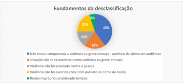 O quadro abaixo, refere-se um estudo realizado no ano de 2023, acerca dos casos de desclassificação dos crimes de roubo para o delito de furto, sendo possível concluir que, a não comprovação da violência ou grave ameaça devido a ausência da vítima em audiência foi a maior causa, representando 40% dos casos: